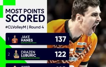 Зад 20-годишния суперталант на "сините" челната тройка допълват Базил Дермо от белгийския "Кнак" (Руселаре) с 16 точки от начален удар и Майкъл Райт от германския "Люнебург" с 12. В Топ 5 са още Мика Ма`а от турския "Халкбанк" (Анкара) също с 12 и Карол Бутрин от полския "Алурон Варта" (Заверче) с 11.
