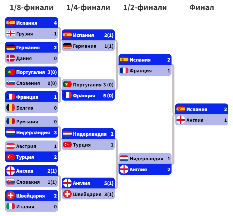 3 гола: Жорж Микаутадзе (Грузия), Джамал Мусиала (Германия), Иван Шранц (Словакия), Коди Гакпо (Нидерландия), Дани Олмо (Испания), Хари Кейн (Англия);