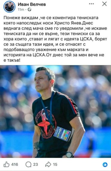 "Понеже виждам, че се коментира тениската, която напоследък носи Христо Янев. Днес, веднага след мача сме го уведомили, че искаме тениската да ни се върне. Тези тениски са за хора, които стават и лягат с идеята за ЦСКА, борят се за същата идея и се отнасят с подобаващото уважение към марката и историята на ЦСКА. От днес той за мен вече не е такъв!", написа Иван Велчев в профила си във "Фейсбук".