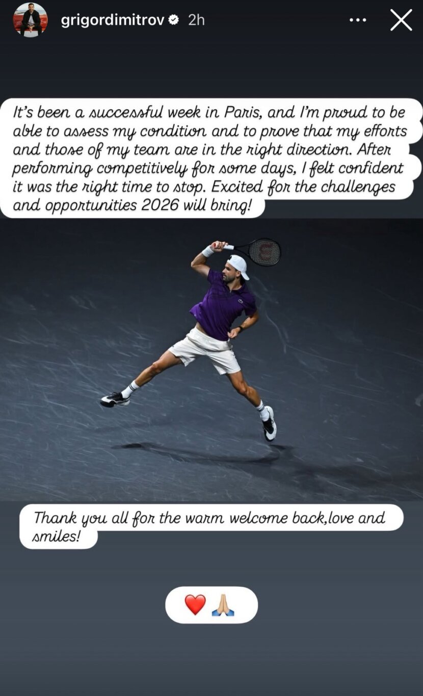 Самият тенисист използва профила си в "Инстаграм", за да успокои феновете си и да отправи послание към тях. В "стори" бившият №3 в света сподели, че е доволен от седмицата в Париж и е видял, че върви в "правилната посока", но също така е преценил, че това е "правилният момент" да спре участието си.