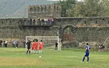 Футболен стадион в крепост привлича погледите на туристите в Кварели, столицата на виното в Грузия.