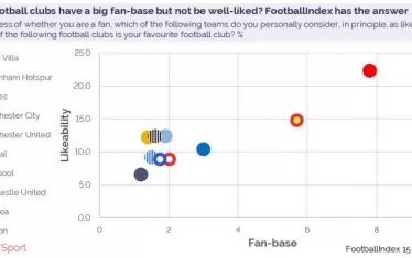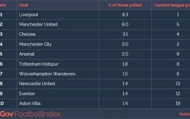 Проучването на YouGov, озаглавено FootballIndex, отчита привлекателността на водещите клубове в Англия за широката общественост по 16 различни показателя. Освен броя на хората, които се определят като фенове на конкретен отбор, водещи фактори са управлението на клуба, нивото на играчите, фен културата, традициите.