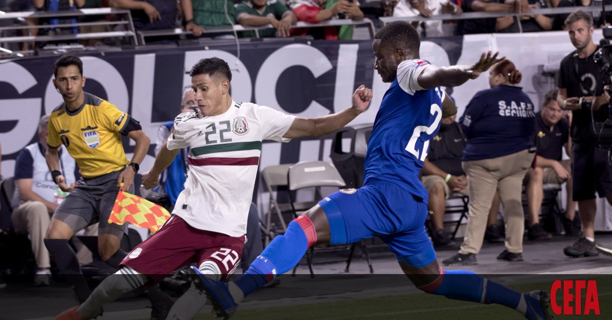 Мексиканецът Уриел Антуня замахва да центрира топката към наказателното поле на Хаити, преди защитникът Алекс Кристиан да е успял да го блокира по време на полуфиналния мач от турнира "Голд къп" - за страните от Северна и Централна Америка. Двубоят в Глендейл, Аризона, завърши с успех 1:0 за мексиканците след дузпа, реализирана от Раул Хименез в 3-тата минута на продълженията. Това ще е 13-и финал за мексиканците, а съперник ще им е победителят от снощния мач САЩ - Ямайка. Досега Мексико е печелил трофея 10 пъти (за последно през 2015 г.), САЩ - 6, а Канада - 2.