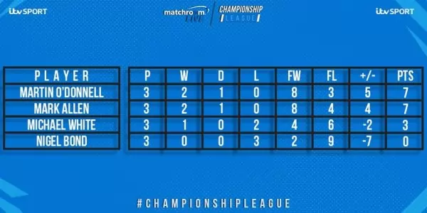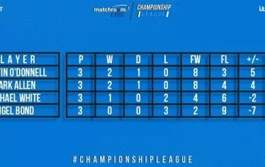 Двамата приключиха с по 7 т., като решаващи за крайното класиране се оказаха мачовете им срещу Майкъл Уайт - О`Донъл го победи с 3:0, а Алън с 3:1. Иначе и двамата надиграха 54-годишния доайен в турнира Найджъл Бонд с по 3:1.
