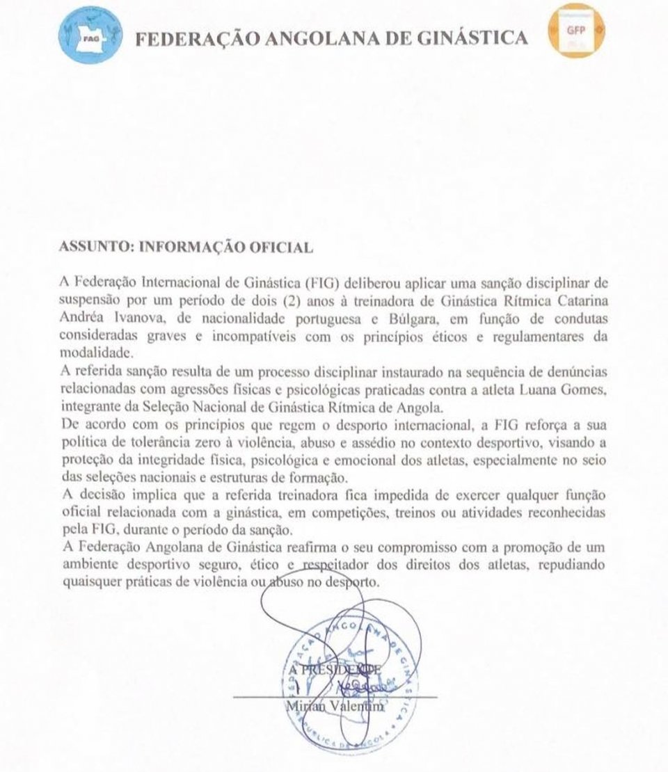"По време на периода на наказанието, треньорката е лишена от всякаква официална функция, свързана с гимнастика, независимо дали става въпрос за състезания, тренировки или други дейности, признати от FIG. Анголската федерация по гимнастика потвърждава ангажимента си за насърчаване на безопасна, етична и уважителна спортна среда, отхвърляйки всякакви практики на насилие или злоупотреба в спорта", пише FAG.