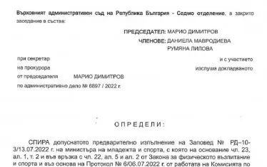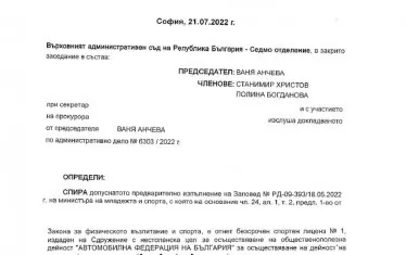 На 21 юли тричленен състав на ВАС с председател Ваня Станчева издава определение по дело 6303/2022 г., с което се спира предварителното изпълнение на заповед РД-09-393 от 18 май на Василев. Това е заповедта за отнемане лиценза на АФБ. И въпросното съдебно определение е вече в сила, след като спортното министерство не е обжалвало в 14-дневен срок, който е изтекъл във вторник, 9 август.