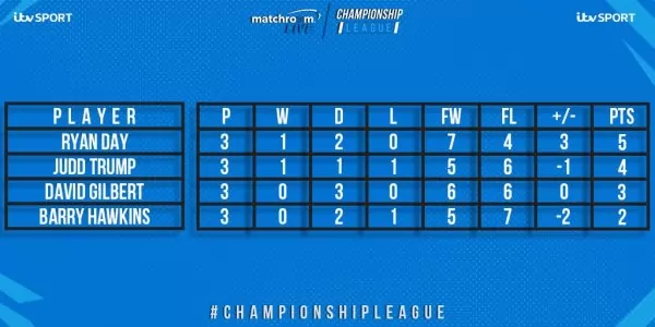 Ден след като любимецът на снукър феновете Рони О`Съливан отпадна от Шампионската лига, надпреварата в Милтън Кийнс (Анг) безславно напусна и световният шампион и безспорен №1 в ранглистата Джъд Тръмп. Асото в колодата остана на второ място в група В от втората фаза и се задоволи с утешителната награда от чекове за общо 10 000 британски паунда.