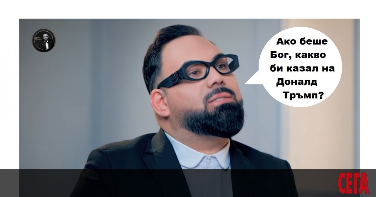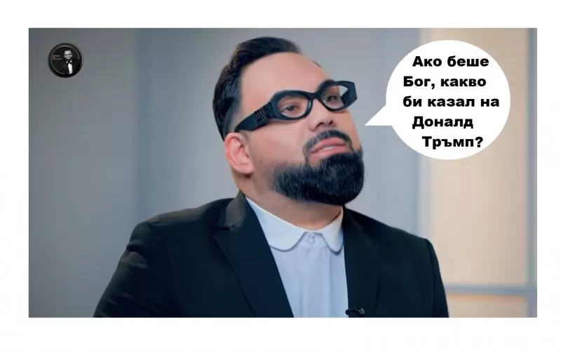 Доналд Тръмп (вратовръзката му щръква): Абсолютна лъжа! Момиченцата изобщо не ме интересуват, Острова на чудесата изобщо не ме интересува. Аз харесвам силни мъже, диктатори. Целият свят ме вижда какво представлявам. Харесвам Путин, Ким Чен Ун, Кмета на Симитли. Това са мъже с характер, това е моята ориентация: геронтофил-диктаторлюб. За такива мъже: уважение, уважение, уважение пред камината. България е луда, че не се възползва от потенциала на Апостол Апостолов и го държи в Симитли. На тоя човек трябва да му се кланяте доземи и да го издигнете пожизнено за властелин без право на замяна. Ако не бях Доналд Тръмп, бих искал да съм Апостола на свободата от Симитли!