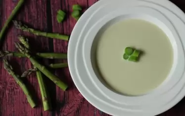 Продукти: 300 г аспержи, 1 глава лук, 1 картоф, 100 г целина (глава), 1 ч.ч. прясно мляко, 3 с.л. масло, 2 с.л. ситно нарязан магданоз, сол, черен пипер.