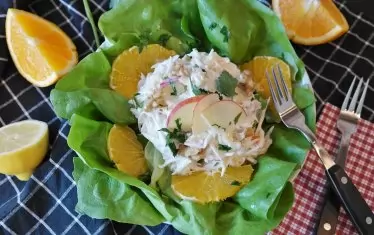 Продукти: 4 глави целина, 2 твърдо сварени яйца, 1 с.л. ситно нарязан магданоз, 2 с.л. олио, сол, черен пипер, 1 ч.ч. кисела сметана, 1 глава кромид лук, 1 домат, 2 с.л. настърган кашкавал.