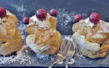 Продукти: За блата: 4 яйца, 4 с.л. брашно, 4 с.л. захар, 1 ч.л. бакпулвер. За еклерите: 250 мл прясно мляко, 50 г краве масло, 150 г брашно, 3 яйца, 1 щипка сол, 1/2 ч.л. захар. За крема на еклерите: 500 мл прясно мляко, 3 жълтъка, 75 г брашно, 120 г захар, 10 г краве масло, 1 капсула ванилия. За крем брюле: 500 мл заквасена сметана, 150 мл прясно мляко, 150 г захар, 6 жълтъка, 1/2 пак. желатин, 1 капсула ванилия