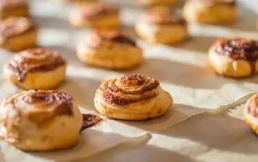 Продукти: 150 мл прясно мляко, 1 яйце, 2 с.л. разтопено масло, 3 ч.ч. брашно, половин ч.ч. захар, половин ч.л. сол, 1 суха мая. За плънката – половин ч.ч. захар, 2 с.л. канела, 100 г размекнато масло, канелена захар за поръсване.