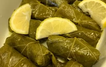 Продукти: 500 г кайма, 1 ч.ч. ориз, 100 г олио, 1 връзка магданоз, 1 връзка пресен лук, черен пипер, пресен джоджен, червен пипер, 1 с.л доматено пюре, 1 с.л. лимонов сок, 30 лозови листа, 50 г масло.