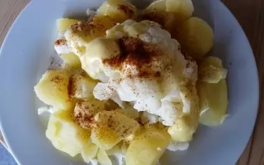 Продукти: 1 глава карфиол, 2 яйца, 4 с.л. краве масло, 1 с.л. ситно нарязан магданоз, 2 с.л. брашно, сол, черен пипер, 1 ч.ч. сладка сметана, щипка смляно индийско орехче, 4 с.л. настърган кашкавал.