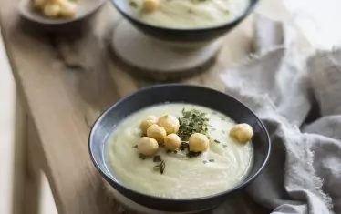 Продукти: 1 малка глава карфиол, 1 глава лук, 5 скилидки чесън, 3 с.л. зехтин, половин връзка копър, 2 кубчета пилешки бульон, половин ч.л. суха мащерка, 200 мл сметана, крутони.