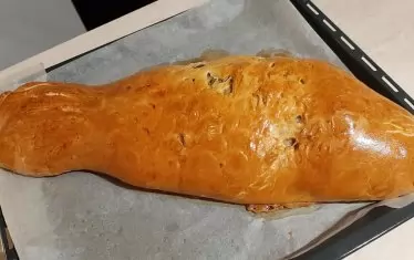 От брашното малко сол и хладка вода се омесва тесто, което се разточва на дебел лист. Лукът се нарязва на ситно и се задушава в мазнината с малко вода до омекване, отстранява се от огъня и се разбърква със ситно нарязаните магданоз и мащерка, едро счуканите орехови ядки, червения пипер, черен пипер и сол на вкус. Предварително изчистеният, измит и посолен шаран се напълва с приготвената плънка, зашива се и се увива в тестения лист, слага се в намазана с мазнина тава и се пече в умерена фурна. Ястието се поднася топло.