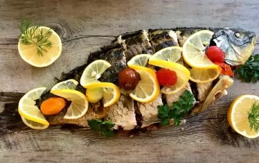 Продукти: шаран 2 кг, 2 връзки магданоз, 10 стръка мащерка, 1 с.л. червен пипер, 1-2 глави кромид лук, 150 г орехови ядки, 3 ч.ч. брашно, половин ч.ч. растително масло, сол и черен пипер на вкус.