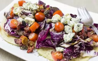 Продукти: 1 резен синьо сирене, 4 шайби ананас от консерва.
