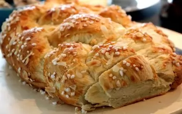 Продукти: около 1 кг втасало козуначено тесто, 200 г счукани орехови ядки, 30 г масло, 100 г мармалад, настъргана кора от половин лимон, 50 г захар. 50 г стафиди, 1 ч.л. канела, 1 яйце.
