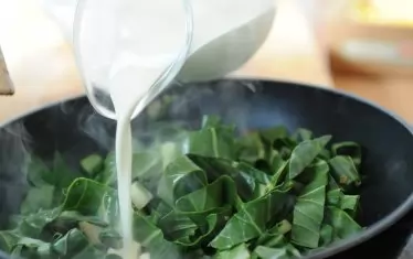 Продукти: 1 кг спанак, 2 с.л. масло, 1 с.л. брашно, 300 мл прясно мляко, 4 яйца, 50 г кашкавал.