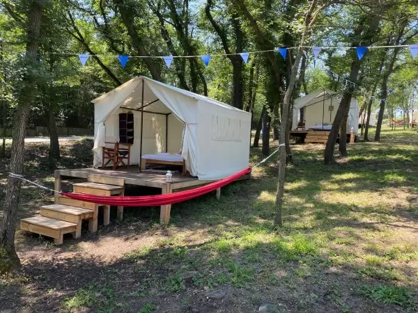 В „Гардения” е забранено да се внасят палатки, но тези, които предлага комплексът, не са какви да е – оборудвани са с ток, дъждоустойчиви, подсигурени с под, защитени от насекоми, заключващи се. В тях има малки мебели, леглата са по две или спалня за двама. Цената – 80-100 лв. на вечер в зависимост от месеца. Именно това е услугата, която се нарича глемпинг (от английски – glamorous, бляскав, и camping). Палатките са в горичка до полянка, наоколо - и смокинови дръвчета, спомен от някогашните екзотични градини. Край палатките обстановката е изключителна, без преувеличение – под сянката на дърветата са опънати хамаци; деца се гонят в тревичките, а после посядат на пейки, с цветя на масите пред тях.