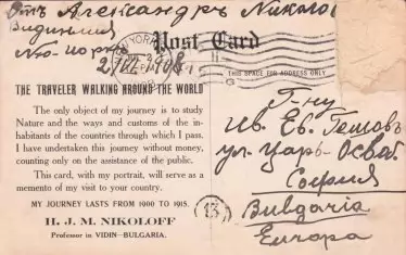 Единствената цел на моето пътешествие е да изучавам природата, както и порядките и обичаите на обитателите на страните, през които преминавам. Предприех това пътешествие без пари, разчитайки само на помощта на почтени хора. Тази картичка ще служи за спомен от моето посещение във вашата страна.