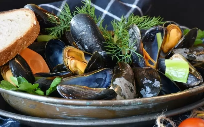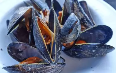 Продукти: 1 кг черни миди, 1 връзка магданоз, 1 дафинов лист, 50 г разтопено краве масло, 1 глава лук, 100 мл бяло вино, 1 с.л. стрита суха мащерка, сок от половин лимон, млян черен пипер, сол.