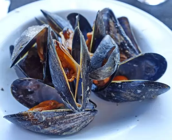 Продукти: 1,5 кг черни миди, 1 глава лук, 100 мл бяло вино, 1 дафинов лист, 1 с.л. брашно, сол.