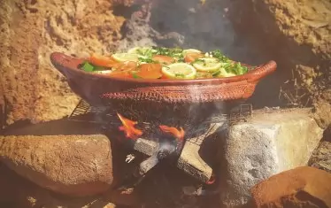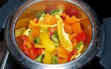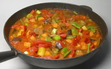Продукти: 1 кг хубаво свинско, телешко или овнешко месо, 5-6 картофа, 1 патладжан, 1-2 тиквички, 200 г зелен фасул, 150 г бамя, 1 морков, 2 домата, 2 глави лук, 100 мл олио, сол, черен пипер, червен пипер, 1 връзка магданоз, 1 люта чушка.