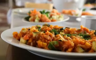 Продукти: 1 кг риба (шаран, щука, костур), 1 кг зеленчуци (картофи, чушка, морков, патладжан, домати), 3 глави лук, 2 скилидки чесън, 1 ч.ч. бяло вино, 2 с.л. растително масло, 1 лимон, 1 с.л. стафиди, малко кориандър, сол, щипка захар, черен пипер, мащерка, магданоз.