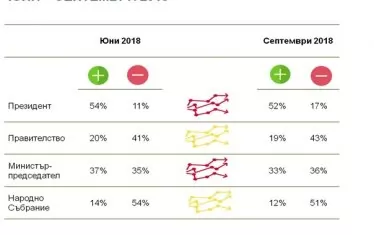 Правителството отбелязва спад от 1% и ръст в негативните оценки от 41% до 43%. Същият тренд бележи и персоналният рейтинг на министър председателя (редуциране на доверието от 37% на 33%, с което се връща на нивата от месец март).