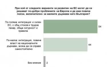 Предвид предстоящите догодина два вида избори – за Европейски парламент и за местна власт – и тяхното значение за мандата на сегашното управление, очевидно всички действия на политическите формации трябва да бъдат четени през призмата на техните стратегии за тези два вота. В този смисъл, съдейки по неотдавнашния вот в Европарламента по повод санкциите срещу Унгария, всички български партии без ДПС, се придвижват в посоката, изразявана от Виктор Орбан. Ако обаче въпросът се постави не конюнктурно, а на принципна основа - при кой вариант могат да се решават по-добре проблемите на Европа, включително на малки страни като България, общественото мнение съвсем не е така еднозначно, а напротив, твърде разделено. 54% смятат, че при по-голяма интеграция и силен ЕС ще има повече ползи за Европа и за страни като България, а според 44% по-добър за България е вариантът по-малка интеграция и по-слаб ЕС. Както при всички европейски избори, така и при предстоящите, местните теми ще имат важно значение, но с оглед ситуацията в Европа може да се предположи, че този идеологически дебат ще доминира и в националните кампании. Аргументите за или против всяка една от позициите могат да се окажат важен фактор за избирателите и да наклонят везните в определена посока.