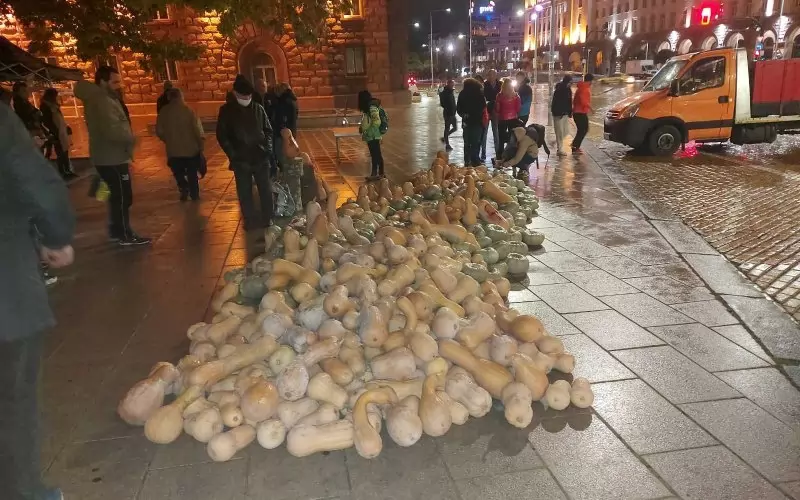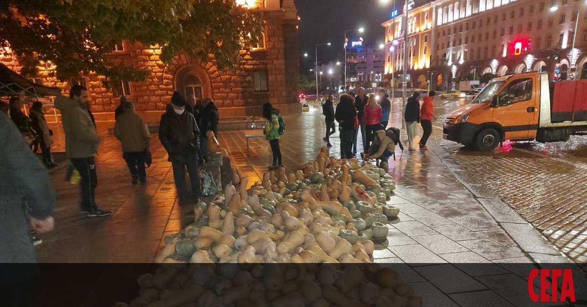Протестиращите се събраха на обичайното място в тригълника на властта. По случай Хелоуин те донесоха купища тикви, които струпаха на площада пред президентството. Малко преди 19.00 ч. камион, натоварен с тикви, бе стоварен на площад "Независимост", съобщи БНТ.