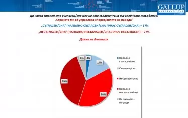 Мнозинството от българите смятат, че нашата страна не е истински демократична. На такова мнение са 77% от сънародниците ни. Това показва глобалното изследване „Гласът на хората“ на световната Асоциация „Галъп интернешънъл“, проведено в навечерието на 2022 г. – преди войната между Русия и Украйна. Проучването, посветено на състоянието на демокрацията, покрива 45 държави по света и около 42 000 пълнолетни граждани, които представляват около две трети от световното население.