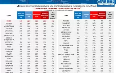 И по двата индикатора (управлява ли се страната по волята на народа и провеждат ли се свободни и честни избори) страната ни се оказва по-скоро в дъното на класацията. Българите са неудовлетворени както от основния механизъм на представителство в демокрациите (изборите), така и от самия принципен характер на упражняването на властта у нас.