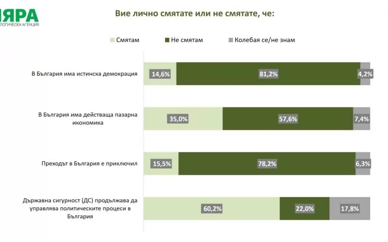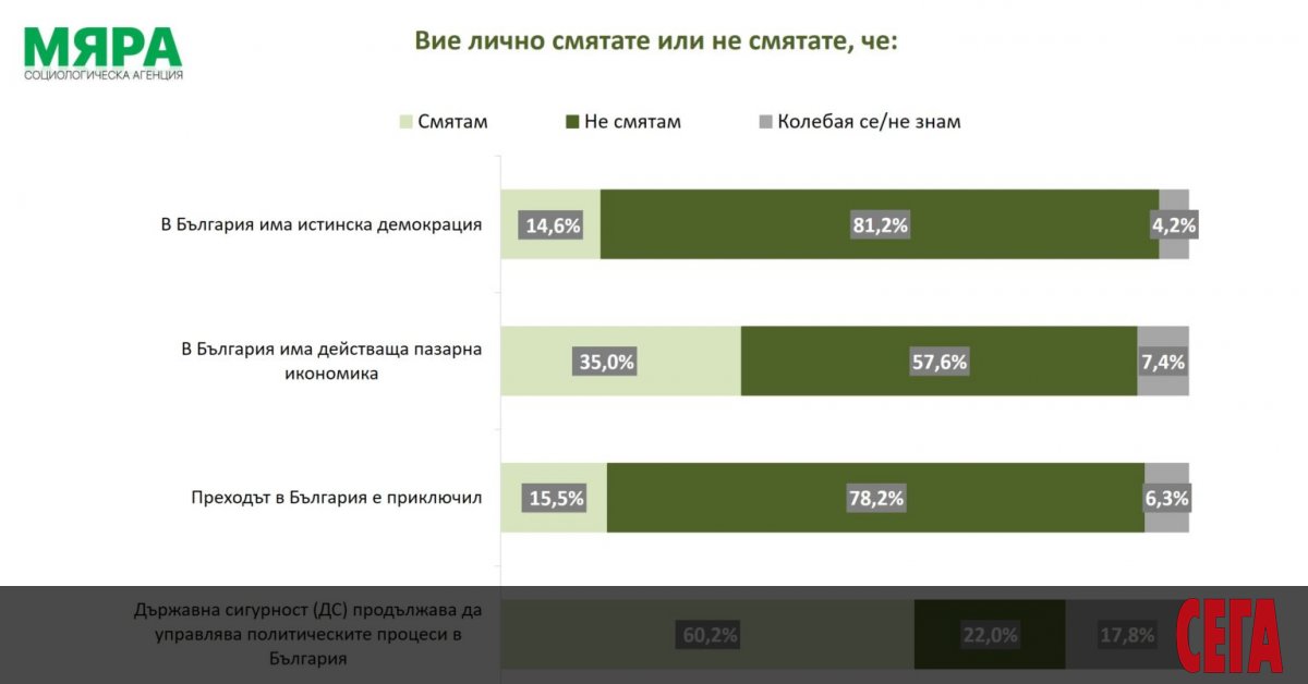 Най-смайващо в проучването е, че 60 процента вярват, че бившата Държавна сигурност все още управлява политическите процеси в България. "Без значение дали става дума за конспиративно съзнание, или пък за преценка на реалности, схващането на мнозинствата е, че близкото минало все още определя днешните ни дни", посочват от "Мяра".