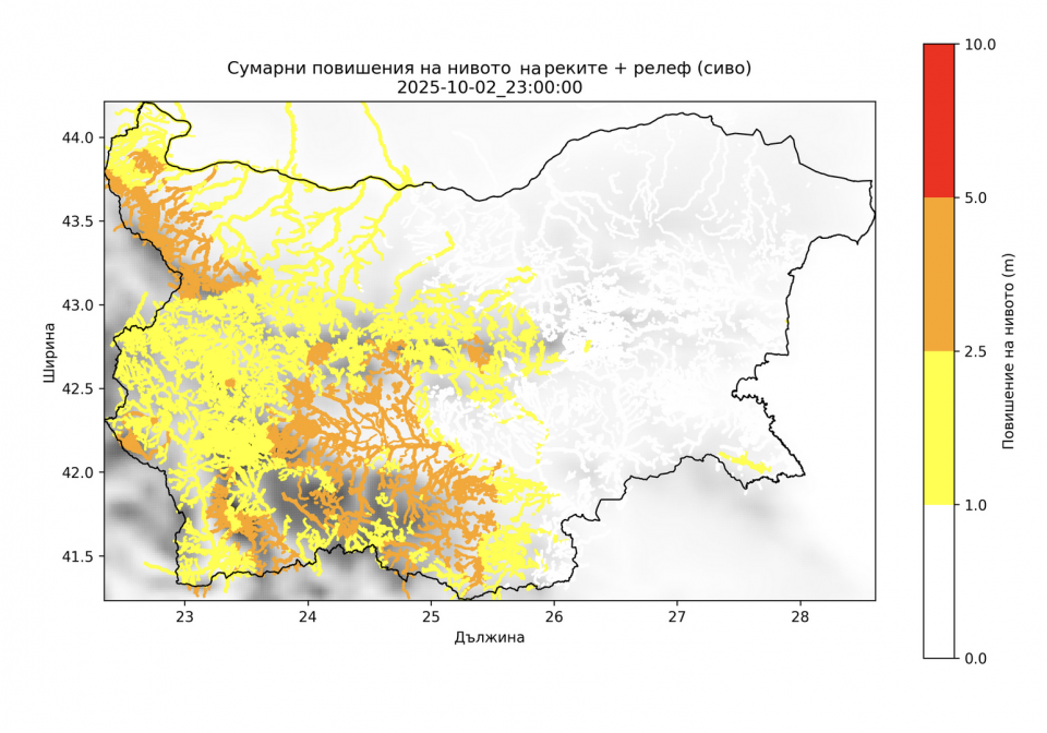Оранжев код за утре е издаден за областите Видин, Враца, Монтана, Ловеч, София област, Пазарджик, Смолян, Пловдив и Кърджали. Най-големи количества дъжд се очаква да паднат в областите Пловдив, Смолян и Пазарджик. За много общини има предупреждение, че ще натрупа снежна покривка до 10 см, както и за опасност от чупене на клони и падане на дървета от натрупан сняг.