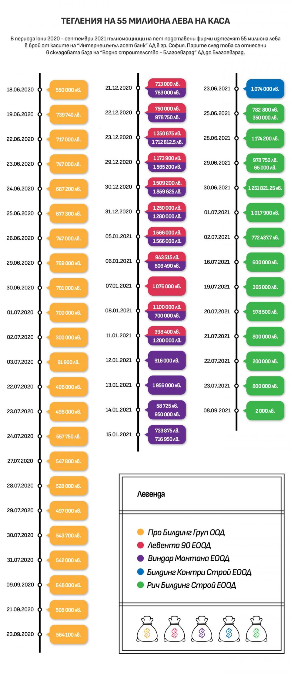 В продължение на година и три месеца, от 18 юни 2020 г. до 8 септември 2021 г., почти всекидневно Данаил Георгиев, Тома Янков, Красимир Митриков и Георги Шкендов посещават централния клон на "Интернешънъл асет банк" в София и изтеглят на каса общо 54 097 641.65 лв. Общо осемнадесет пъти обвиняемите са напускали централата на банката със суми в брой на стойност над един милион лева, като най-голямата изтеглена на каса сума е 1,956 млн. лв.