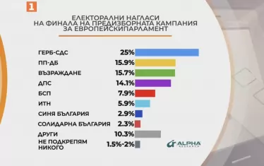 25,1% за ГЕРБ, 15,4% за ПП-ДБ, 15,2% за "Възраждане", 14,8% за ДПС и 6 сигурни партии в Народното събрание. Това дава последното социологическо проучване на "Алфа рисърч" за предстоящите в неделя избори. То е проведено сред 1000 души в дните 1-4 юни и тази сутрин бе представено в ефира на БНТ.