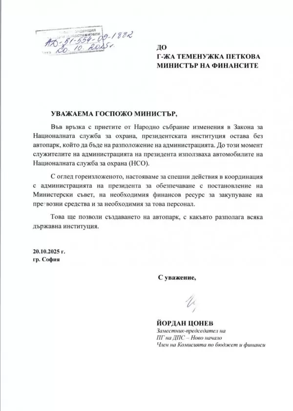 Днес пресцентърът на ДПС-НН разгласи новата сцена от тази пиеса – пратеното писмо до финансовия министър. В него се "настоява за спешни действия в координация с администрацията на президента за обезпечаване с постановление на Министерски съвет на необходимия финансов ресурс за закупуване на превозни средства и за необходимия за това персонал". В прессъобщението се допълва, че президентството трябва да разполага с автопарк, "независимо от това кой е заемащият длъжността президент, защото е важна институцията, не персоната, която я представлява в определен отрязък от време".