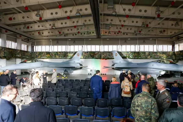 Министърът на отбраната Атанас Запрянов и началникът на отбраната адмирал Емил Ефтимов застанаха начело на официалната церемония по приключване на доставките на самолети по първия договор за придобиване на F-16 Block 70.