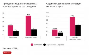 Когато обаче се разгледат съдилищата, не сме чак такива "отличници“ - средният брой съдии на 100 000 души е почти два пъти над европейската медиана, докато разликата при администрацията спрямо медианата не достига два пъти. България е на пето място както по брой съдии на 100 000 души след Словения, Хърватия, Гърция и Люксембург, така и по отношение на съдебната администрация - след Испания, Полша, Хърватия и Словения.