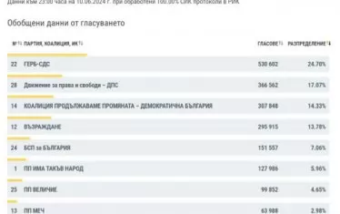 При 100% обработени протоколи от евровота към 20.00 часа ГЕРБ-СДС запазва лидерската си позиция с подкрепа от 23.54% или 473 994 гласа.