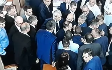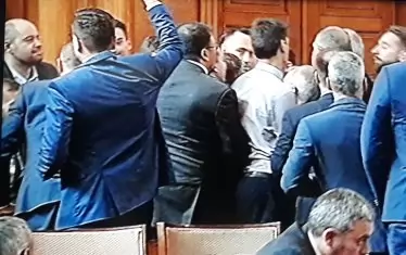 Тогава Костадинов и хората му се насочиха директно към Митев, който обаче получи подкрепата на съпартийците си. Депутатите се сбутаха едни други, видя се и дърпане на вратовръзки - като Митев беше този, който първи посегна към връзката на Костадинов. До размяна на удари обаче не се стигна. За да успокои ситуацията, Вигенин прекъсна заседанието.