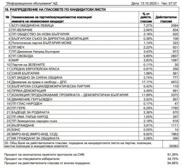ДПС (абревиатурата на "Ново начало" за вота) има малко под 17%, ПП-ДБ - 12.41%, а на трето място изненадващо е партия "Свобода" с над 9 на сто. Това е водещата тройка при обработени 94% от протоколите за общински съвет в Пазарджик. ПП "Свобода" е на бизнесмена и общински съветник Румен Димитров. На следващите места са БСП със 7.65%, ГЕРБ с 6.38 и ВМРО на бившия кмет Тодор Попов с под 6 на сто. Изключително слабо е представянето на ГЕРБ.