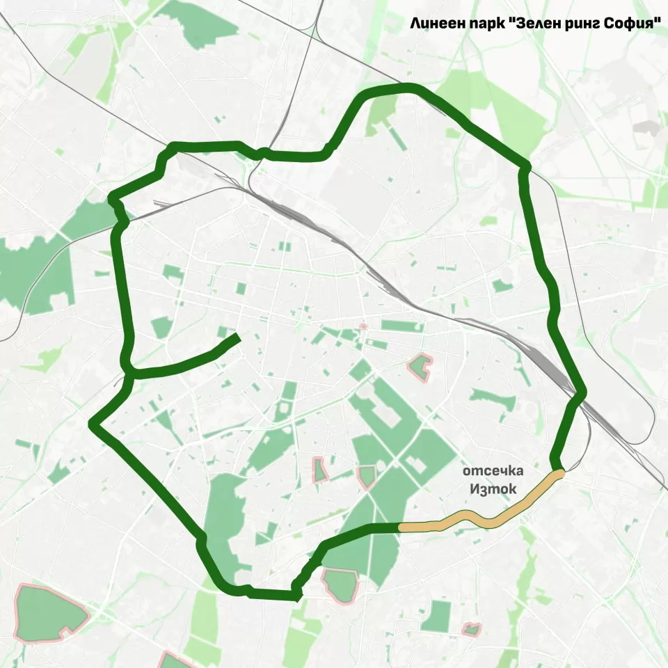Първият участък от реализацията ще бъде от гара „Пионер“ до бул. „Шипченски проход“. Следващият етап включва възлагане на изработването на технически проект и избор на изпълнител. В момента се подготвя задание за проектиране. Планира се строителството на първата отсечка да стартира в края на 2026 г. Паралелно с това Столична община работи и по подготовката на още три участъка от бъдещия линеен парк. В процес на подготовка е и изменение на уличната регулация в НПЗ „Средец“ (промишлена зона), което ще осигури непрекъснатостта на трасето. В този участък Зеленият ринг ще свърже кварталите „Красна поляна“ и „Сердика“ с „Лагера“, „Белите брези“, „Красно село“ и „Славия“, уточняват от общината.