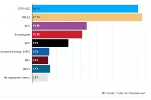 Ако сега имаше избори, те вероятно биха показали сходен резултат с очакваната в такива моменти положителна инерция за печелещите от 2 април и негативна за губещите. ГЕРБ-СДС биха били на първо място с 26,8% от гласовете, а ПП-ДБ – на второ с 24,1%. "Възраждане" е трета сила с 14,7%, а ДПС – четвърта с 13,9%. БСП е на петото място с 9,1%. Близо около бариерата е "Има такъв народ" с 4,1%. Недалеч под бариерата личат "Български възход" с 3,2%, а "Левицата" е с 1,5%. Останалата подкрепа отива за по-малки формации.