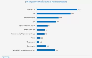 Пет са сигурните формации в следващото Народно събрание, а за още две изборната кампания ще е решаваща. С 22,9% от онези, за които може да се очаква да гласуват - ГЕРБ в коалиция със СДС са на първо място, следвани от БСП с 19,2%. Това сочи най-новото изследване на "Галъп Интернешънъл", оповестено днес.
