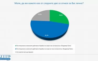 47.1 на сто изразяват несъгласие с действията на руския президент Владимир Путин в Украйна. На обратното мнение са 28.6 на сто. Останалите се колебаят. Следва да се има предвид, че част от отговорите може да съдържат елемента на „желателния отговор“, предупреждават социолозите.