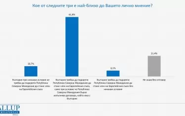 10 към 1 (61.8% срещу 6.1%) е съотношението при анкетираните между тези, които смятат, че Скопие трябва да изпълни договора за добросъседство с България, за да влезе в ЕС, и другите, които считат, че съседите трябва да получат безусловна подкрепа от София. Всеки десети анкетиран вярва, че Северна Македония не бива да бъде допускана в ЕС при никакви условия.